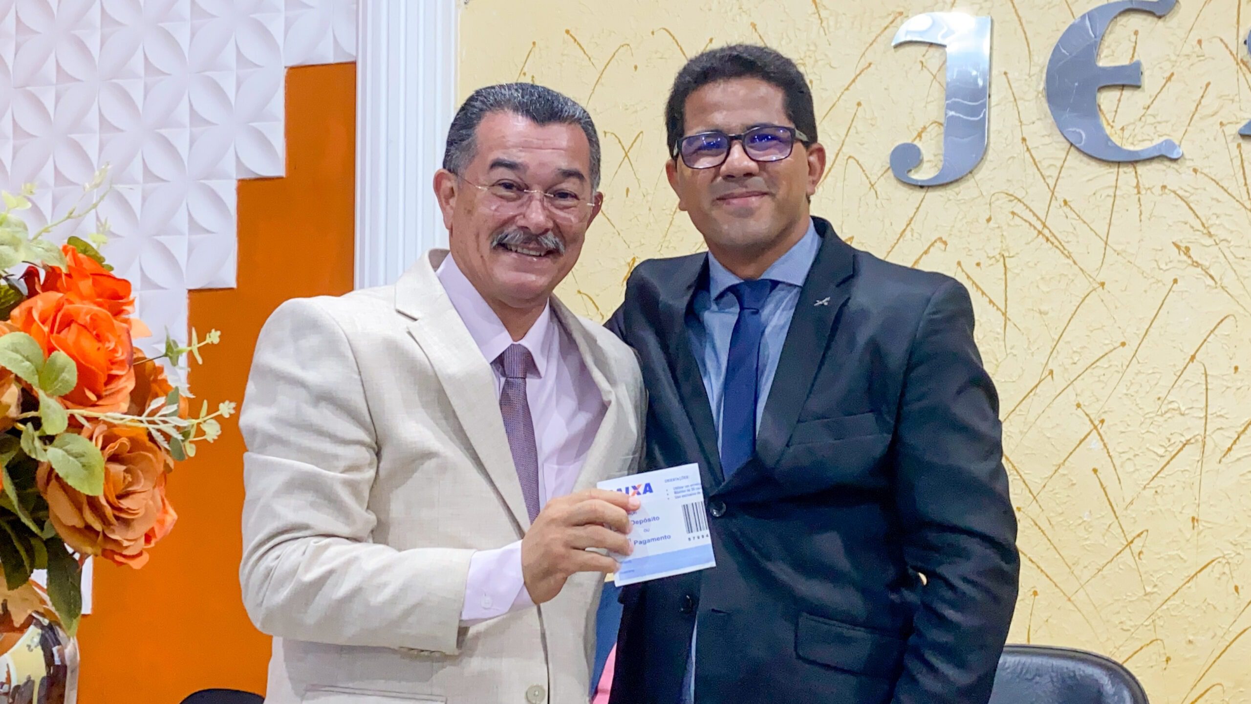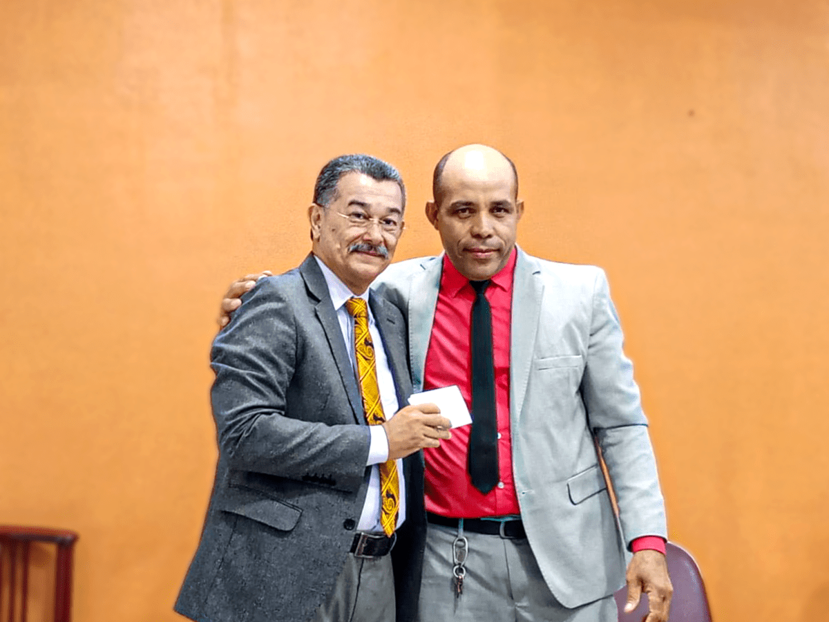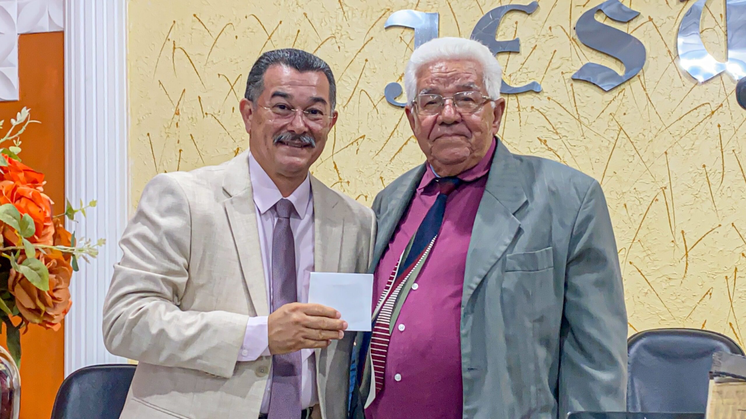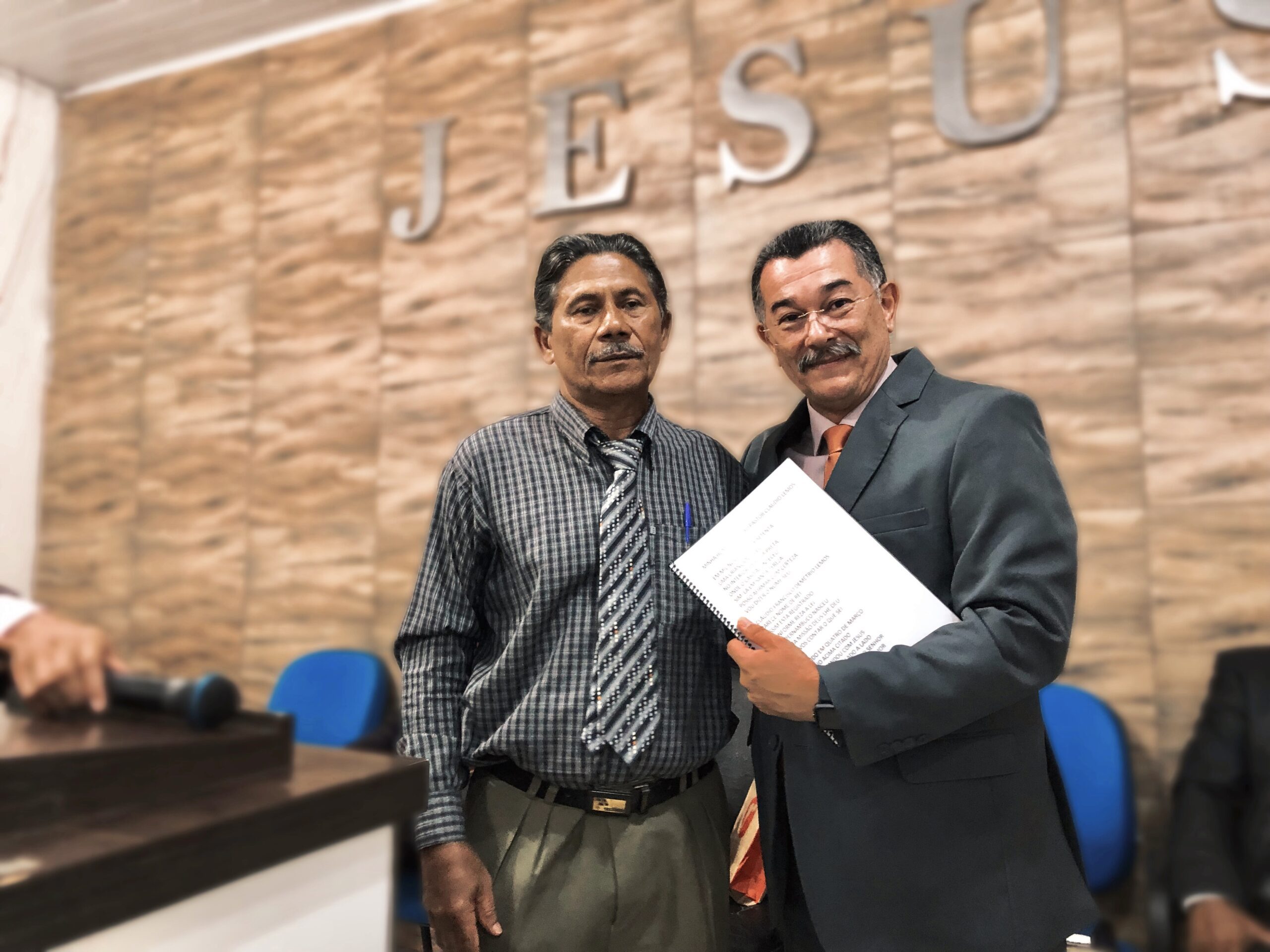 O presbítero Dario Fernandes leu em 1 coríntios 15 :10 para o pastor Cláudio.