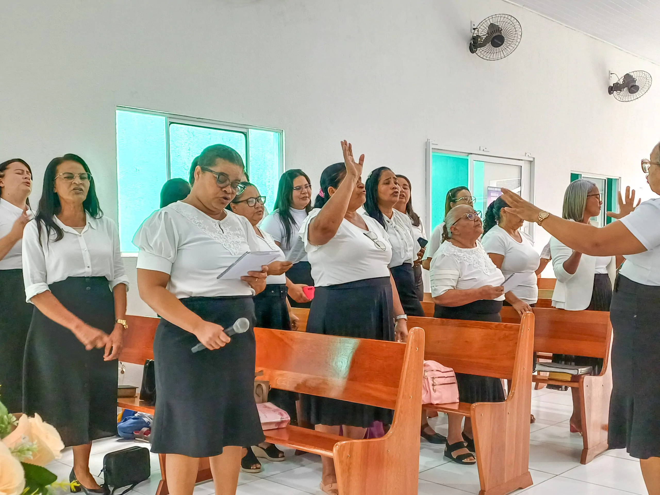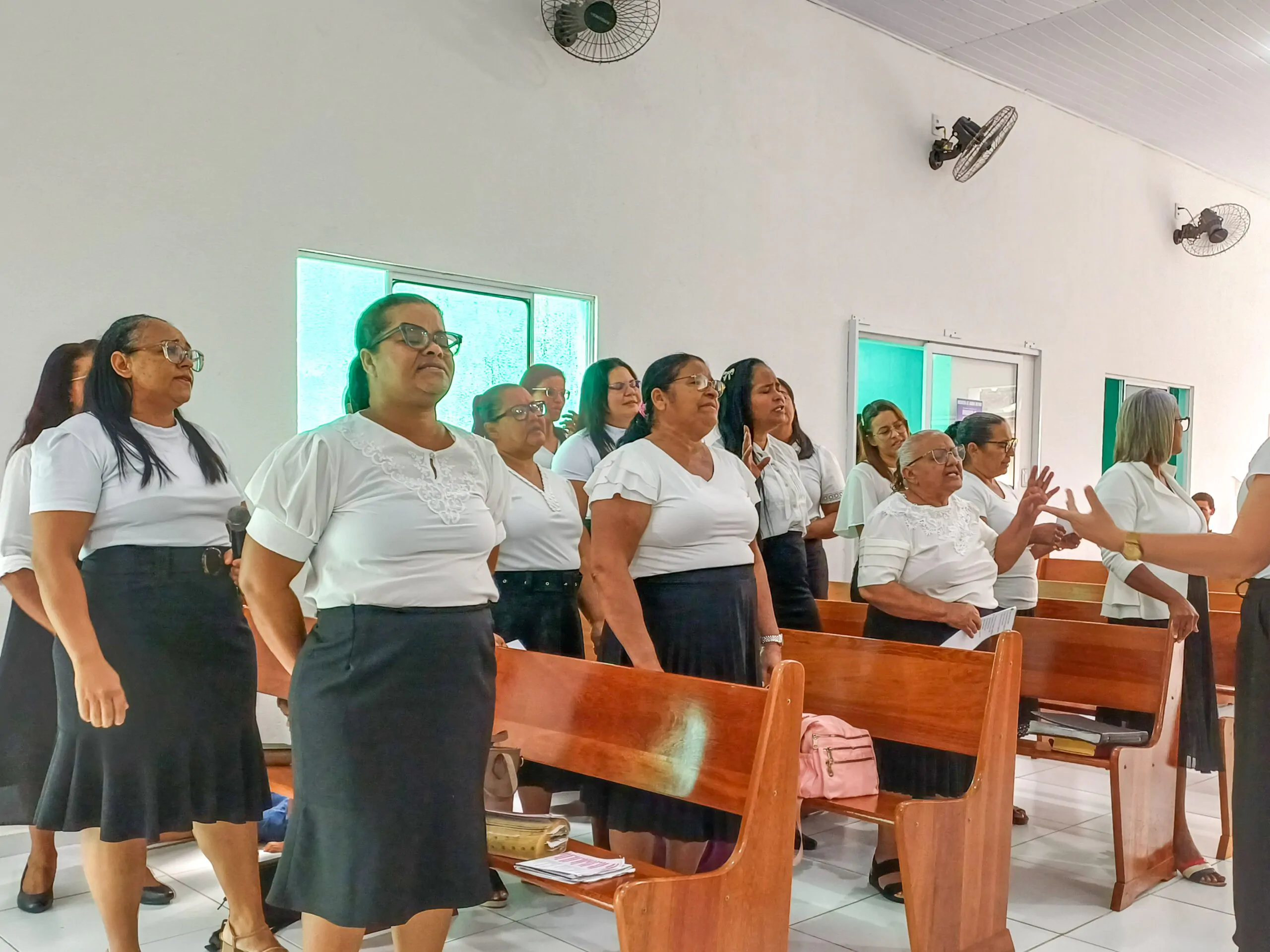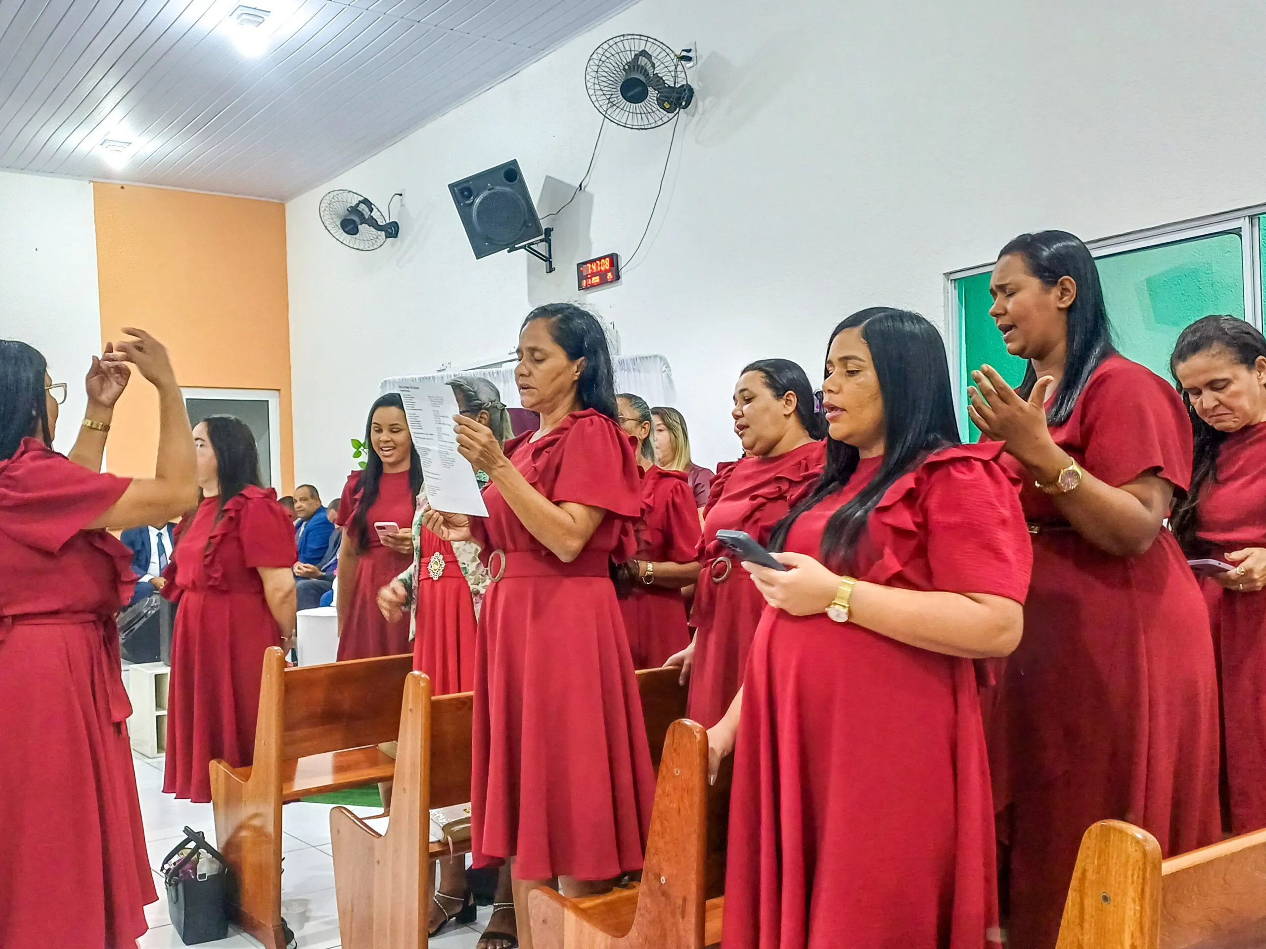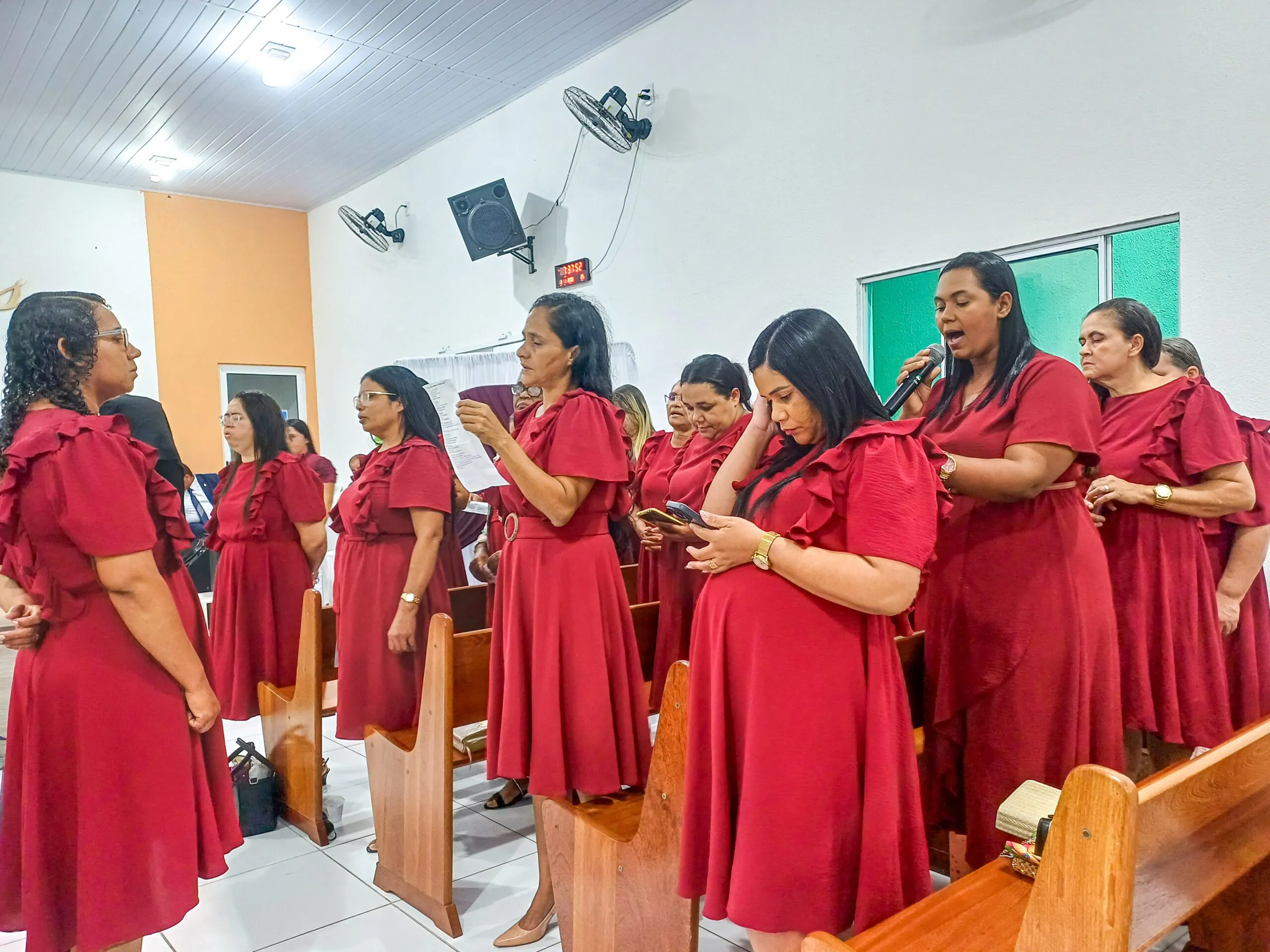 Durante o culto, o departamento de senhoras Diante do Altar e o departamento de senhoras Vaso de Alabastro (congregação Casas Novas) louvaram ao Senhor. Algumas irmãs também tiveram oportunidades para adorar a Deus. Elas agradeceram ao Senhor e compartilharam versículos bíblicos.
